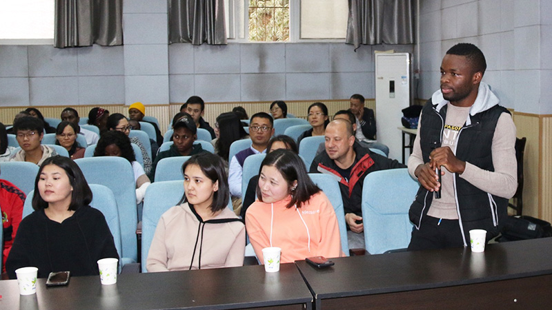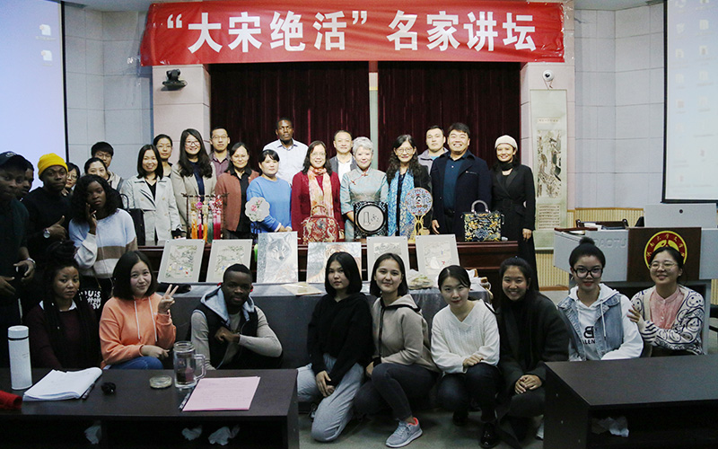 魏然大师提前带到现场的精美绣品引起了众多师生的关注和兴趣。国际汉学院刘绣华院长首先热情地致欢迎词,马惠玲副院长主持介绍了魏然大师在汴绣领域获得的卓越成就,讲座在大家期待的目光中开始。魏然大师从个人刺绣经历讲起,逐步为大家介绍中国刺绣与汴绣的起源与发展,以及各绣种的艺术特色,然后论述了当代汴绣近四十年的发展,对汴绣目前面临的问题、传承与保护以及发展趋势和意义等做了精彩讲解。一幅幅精美的“魏然汴绣”作品令大家赞叹不已,在中场休息时中外学生纷纷上前观赏绣品,并与魏然大师交流或合影留念。其后的提问和交流互动环节有的国际学生表现出对汴绣的强烈兴趣,同时也关注到汴绣的创作时间与学习难度。非洲学生叶伟宁还即兴演唱了一段豫剧表达自己克服困难学习中国文化的决心。国际汉学院梁建忠书记在讲座结束时做总结发言,感谢魏然大师的精彩讲座,表达了对文化传承的理解,并希望魏然大师能在国际学生中培养汴绣弟子,使汴绣文化也走进国际汉学院的课堂。最后的现场针法演示讲解和学生们的实际学习操作环节也收到了良好的效果。
