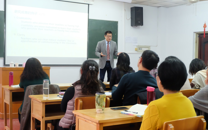 林阳教授首先介绍了教学传播学及其主要的研究对象:学生和教师,随后从学生之间的交流、教师之间的交流、社交媒体对学生的影响、教学思路、课堂管理以及教师和学生之间的互动六个方面展开作了具体说明。林教授提到教学中可以采用定量分析的方法,借助调查问卷等形式,充分了解学生的学习方式、学习态度、学习效率等情况,并对教师提出了一些新的要求和建议。他强调,在教学过程中,教师应增加在学生之间的可信度和授课的清晰度,帮助学生减少学习中的焦虑,课堂上也可以多采用幽默风趣的授课形式,以充分调动学生的积极性,从而提高教学效率。他还对汉语教学的现状作了简要分析,指出目前我们的汉语教学及研究很大程度上受到了西方的影响,提倡青年教师应注重培养创新型思维和科学严谨的研究方法,努力增加教学技能,并与学生建立新型的良好的师生关系。报告的尾声,林教授同师生亲切交流,并对师生提出的学术问题作了详细的解答。他强调,教学传播学是一个动态的过程,教师的教和学生的学同样重要,这个过程受到很多因素影响,因此会有更多的课题留给我们研究。我们青年教师应从多个角度思考问题,以更科学、更有效的方法投入到教学活动中去。
