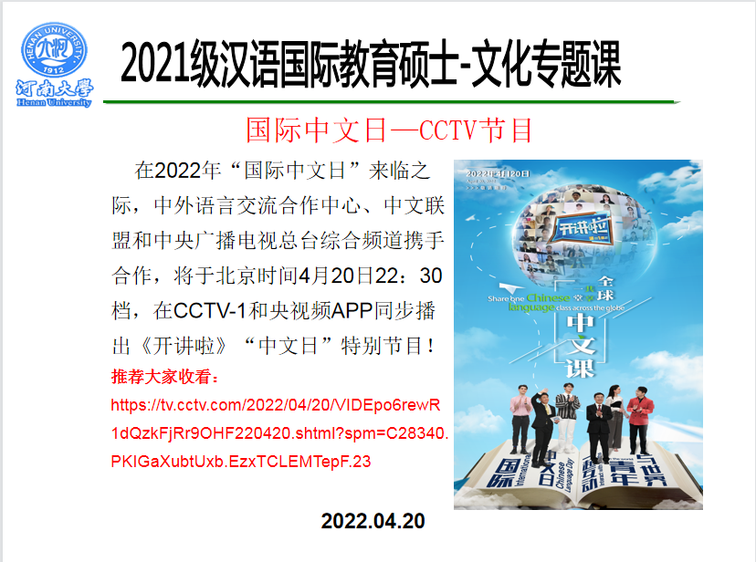 中外语言交流合作中心、中文联盟和中央广播电视总台综合频道携手合作,于4月20日22:30在CCTV-1和央视频APP同步播出《开讲啦》“中文日”特别节目,节目邀请世界汉语教学学会副会长、北京大学对外汉语教育学院院长赵杨教授作为主讲嘉宾,现场讲授中文蕴含的中国文化和中国智慧。国际汉学院组织教师和国际学生线上观看。