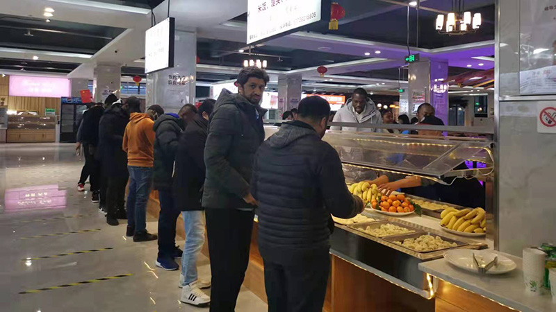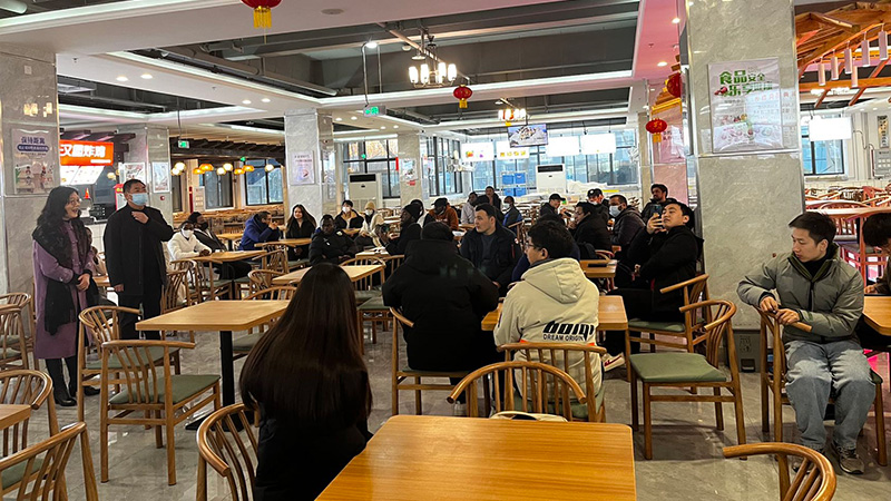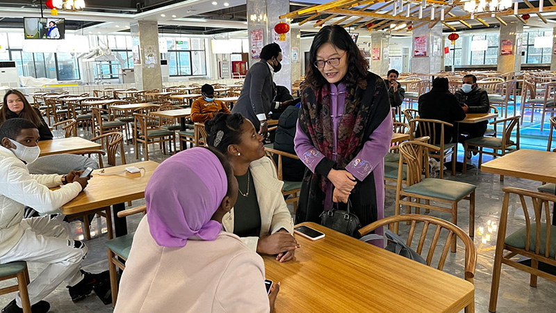 2022年1月31日,国际汉学院院长刘绣华、党总支副书记王林丽来到明陞m88官方网站地址明伦校区中心食堂,与春节期间留校的国际学生共度除夕,喜迎新春。