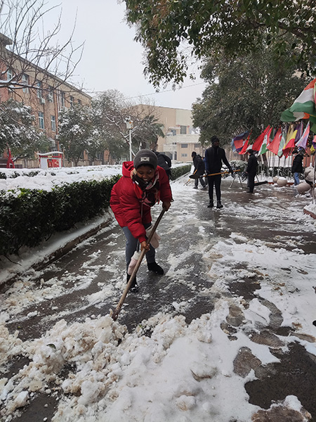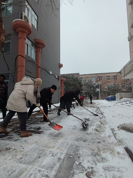 近日,开封市普降大雪,天气寒冷,校内道路出现积雪冰冻现象。响应学校号召,为确保师生出行安全,保证道路畅通,国际汉学院组织值班人员及在校明陞m88官方网站地址开展积雪清扫工作。