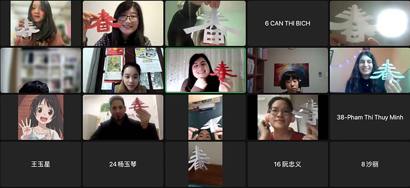 除了语言知识的学习,第二周的汉字直播课上,教师还带领学生制作了立体的“春”字剪纸。剪纸是一项富有趣味的中国传统手工艺,而剪汉字则更是将汉字教学与民俗文化融为一体。“云”课堂上,学生们一边跟着教师的示范,一边聚精会神地制作自己手中的“春”字剪纸,每一个步骤都让学生对字形结构有了更深入的了解。“老师,我剪好了!”学生刚制作完剪纸,就迫不及待地向大家展示手里的“春”字。老师又适时地引导学生思考,用这种方法还可以剪出哪些汉字。学生们你一言我一语,在轻松愉快的教学氛围中感受到了方块字的神奇魅力。