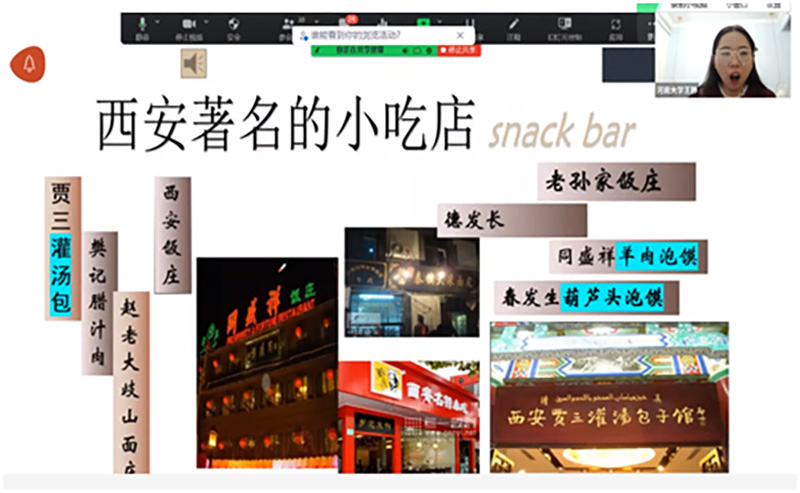 直播课从西安回民小吃街开始,老师们一边讲解美食,一边教学生们扫码点餐、付款,带领学生们乘坐地铁参观大雁塔和兵马俑,随后教授学生网购火车票乘高铁前往洛阳。学生们认识了中国的高铁,“品尝”了洛阳水席,“参观”了白马寺和龙门石窟,认识了国花牡丹,了解了郑州由“县”到“州”的变迁。在老师们热情细致的讲解下,学生们身临其境,纷纷参与留言互动,表达了对中国文化的热爱和留学河大的愿望。