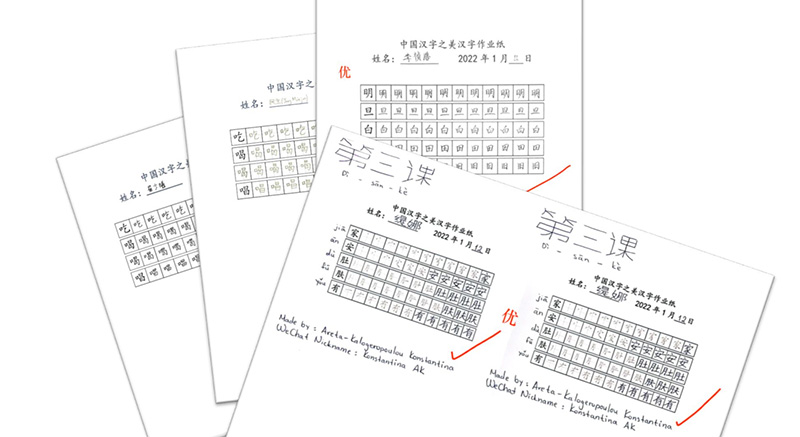 每堂课程结束后,教师们通过微信群向学生发送课程作业,用电子邮件的方式为每位学生批改、反馈。项目共分为五个班级同时进行,不同的班级的学生各有特点。令教师们欣慰的是,虽然学生们拥有不同的国籍,来自不同的文化背景,有着不同的汉语水平,但是在学习中都表现出对汉字知识的喜爱。为了能够写得一手工整、规范的汉字,有学生主动请教老师,反复练习。