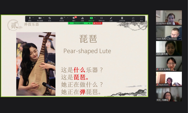 随后,学生们进入了各自所在学校所在班级的线上课堂,开始第一节课的教学。王鹏老师积极组织教学,同学们在轻松快乐的气氛中相识,开始了中国音乐课的体验。在豆会老师的第一节课《中国乐器》中,美国大学生认识了丰富的中国乐器,学习了乐器演奏有关的动词“吹、拉、弹、敲”等。课堂中播放的河南卫视《兰陵王入阵曲》《唯美中国·开封版》展示了符合当今中国的热点和真实现状,美国大学生们表现出了对中国文化浓厚的兴趣。现场气氛融洽,距离在亲切友好的课堂讨论中不断拉近。第一次的美国秋季大学生线上课堂在学生的积极发言、老师的倾情讲演、助教的有效配合中落幕。