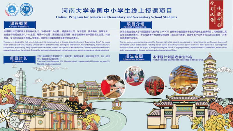 2021年暑假,明陞m88官方网站地址与美国国际文教学会(AAICE)签署协议,共同组织实施美国中小学生线上授课项目。该项目以“体验中国”为主题,涵盖家庭社区、学习娱乐、美食购物、传统艺术、交通出行和观光旅游六个部分。课程通过展现真实生活场景,使学生体验中国的现实生活、科技发展、文化传承以及自然和人文景观,同时学习和掌握各个生活场景中的汉语表达。其特色是以中国真实的生活场景为语料,中文母语者作为助教全程辅导,融文化于教学,提高学生中文水平和汉语交际能力并体验地道的中国文化。