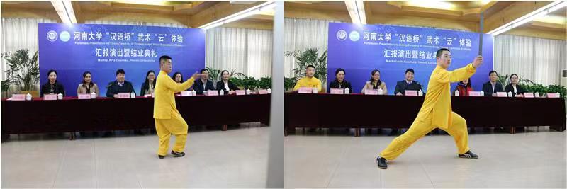 武术学院张伏伟老师和邵瑞鹏老师不仅分享了自己两周来的教学感想,还在现场带领学员们一起演练了少林拳和太极拳,随后又为大家带来了精彩的少林拳、硬气功和太极拳的表演,赢得了阵阵掌声。