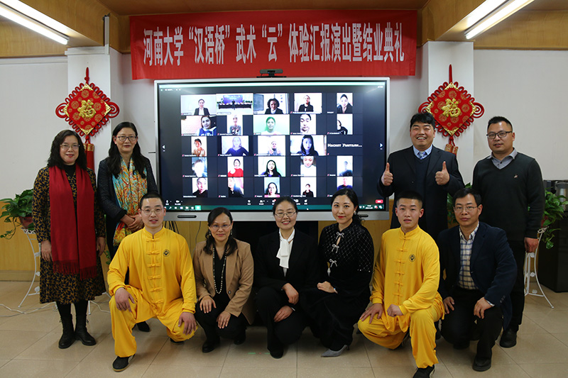 2021年1月29日下午四点,由教育部中外语言交流合作中心主办、明陞m88官方网站地址承办的“汉语桥”武术“云”体验项目结业典礼暨汇报演出在国际汉学院会议室举行。