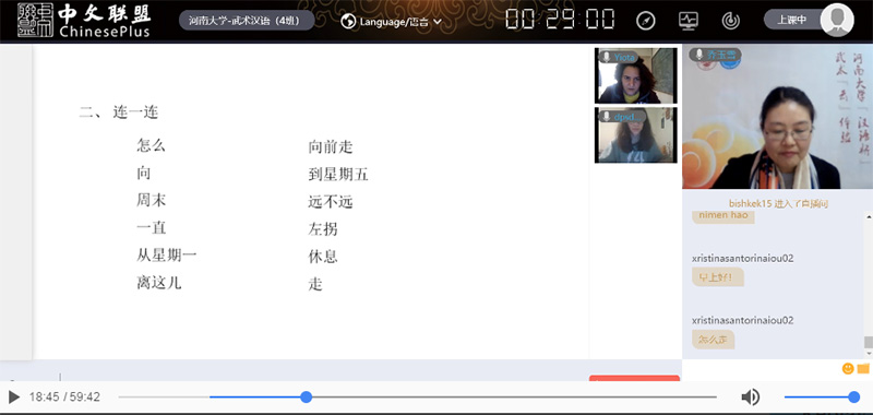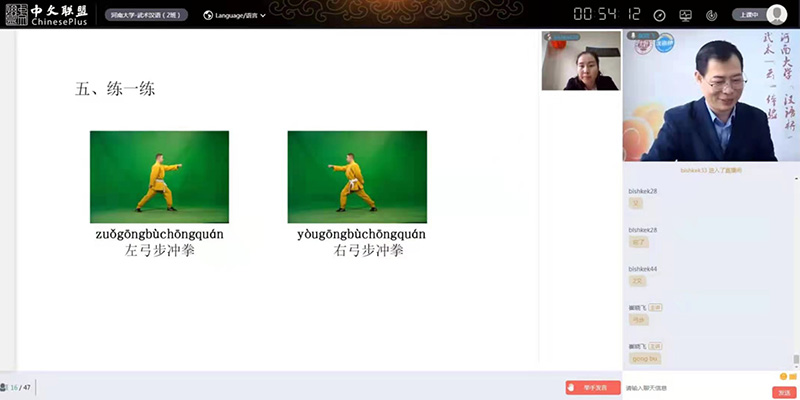 2021年1月18日下午三点,由教育部中外语言交流合作中心主办、明陞m88官方网站地址承办的汉语桥武术“云”体验项目“武术汉语”准时开课,一百多位注册学员分四个班,同时参加网络直播课程,此次为国际汉学院教师首次进驻中文联盟直播间授课。