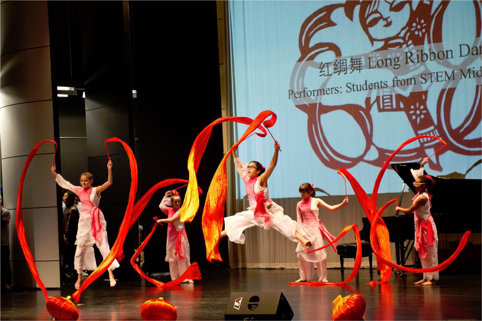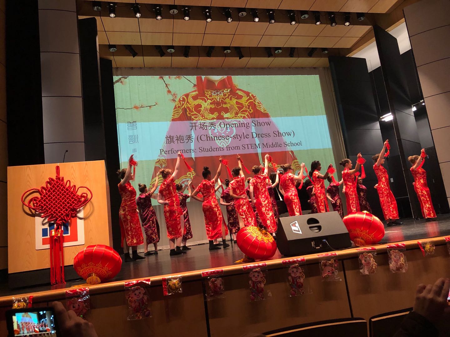 7:50分,孔子学院STEM中学教学点的20位女生带来的旗袍秀,拉开了春晚的序幕,豆蔻碧玉年华的美国孩子们,沉浸在旗袍之美的展示中,俨然似经过专业训练的模特队;5位STEM中学初中部学生表演的红绸舞与舞台背景民族舞剪纸投影巧妙地构成一幅同心协力、激情追梦、合作共赢的欢快和谐画面,把观众带到了盛世中国开门红的场景,迎来热烈的掌声。让人惊叹的是:这些孩子们精彩的表演,仅仅是利用课余时间,在本土汉语老师梁晴女士指导下,学生们出于对中国文化的强烈兴趣而刻苦练出来的。汉语是该校唯一一门外语课,由于出色的汉语教学项目,吸引了周边社区不少学生家长为孩子选择该校就读。该校也成为阿克伦大学和其他理工科院校的重要生源基地。