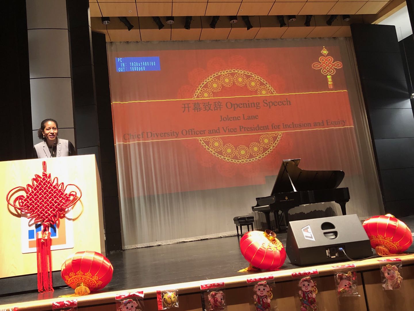 春晚节目表演安排在艺术博物馆斜对面与之一路之隔的市公共图书馆礼堂。春联、剪纸、中国结、纸鞭炮、大红灯笼和立体的金猪纳福挂饰,使整个礼堂洋溢着浓郁的中国年味。孔子学院老师特别安排孔院汉语班在读学员洁玛(Gema Suarez)和首届毕业生、校友白伟义(Doug Beltowski)与中国明陞m88官方网站地址志愿者共同担任节目主持人。阿克伦大学副校长乔琳娜·莱恩(Jolene Lane)女士亲临晚会致辞,她高度肯定了孔院对阿克伦大学多元化所作的贡献,并热情地用现学的汉语向阿克伦大学中国学生、学者祝贺新年。