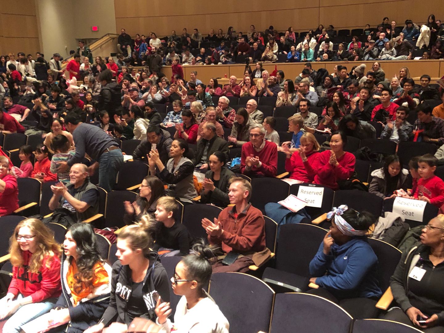 本场晚会还精心设置了幸运观众领奖环节。孔院师生在布置会场时,将在课堂上教学员学习的剪纸作品“招财猪”随机粘贴在观众座席底部。9:00时,节目接近尾声,随着中国明陞m88官方网站地址合唱的《稻香》的袅袅余音,主持人宣布:歌声将我们带到最初的美好,猪年意味着招财进宝!亲爱的朋友们,我们将要说再见了,再见之前,请查看您的座席下面,若有“小猪剪纸”被发现,请您走上舞台,阿克伦大学孔子学院将给您意外的惊喜!” 与此同时,所有演员们回到舞台上,向观众们抛布猪娃娃,两位发现“小猪剪纸“的小观众雀跃地跑向舞台,孔子学院美方院长林阳、中方院长刘绣华分别向两位幸运小观众赠送了“幸运猪”,引爆全场一片沸腾。两位幸运者抱着几乎和他们个头一样大小的“猪”,神气自豪地接受“咔咔嚓嚓”的抢拍…….. 其中一位还激动地告诉孔院的老师们:“我的姐姐现在在STEM中学学习中文,等我上中学了也要学中文…….