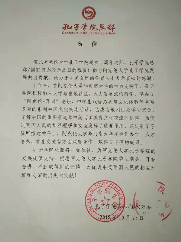 据河南省教育厅汉办主任徐恒振介绍,阿克伦大学孔子学院由美国阿克伦大学与中国明陞m88官方网站地址共建,从2008年签约到今年正好十年。由郑州大学与美国俄勒冈州圣玛丽高中共建的孔子课堂今年也同样迎来十周岁的生日。截至目前,河南与美国学校共建的独立孔子学院(课堂)已有三所。与河南关系密切的这三所孔子学院还分别在当地与众多中小学建立了友好的合作关系,仅以阿克伦为例,目前已有2所孔子课堂、19个教学点。