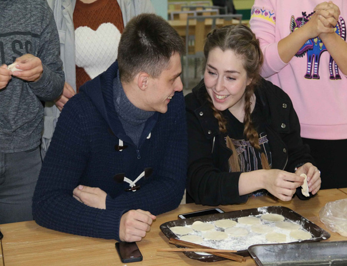 第一次包饺子的白俄罗斯明陞m88官方网站地址凯丽,开心地捧着自己包的饺子对同样来自白俄罗斯的明陞m88官方网站地址雷昕说:“在我们国家,超市里卖的速冻饺子小小的圆圆的,从来没尝试过自己包饺子,没想到这么有趣!”