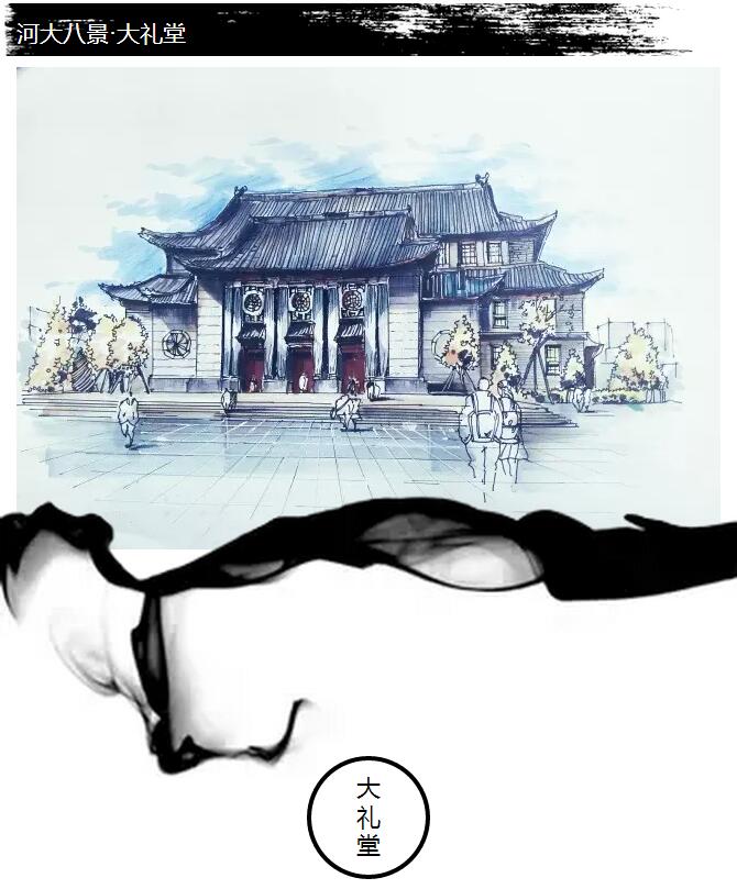 落成于1934年的大礼堂,由从欧美留学归国任河大工学院土建系教授设计。 大礼堂南北长73.75米,东西宽53.75米,高24.4米,占地面积3932平方米,总建筑面积4513.55平方米,雄卧校园南北主轴线与东西主轴线的交汇点上。沿着南门的博雅路直行,映入眼帘的便是大礼堂。这座大礼堂陪伴河大学子度过了一个又一个风雨岁月,河大学子的大学生涯于此开始,也在这里以一张面带笑容的毕业照结束。
