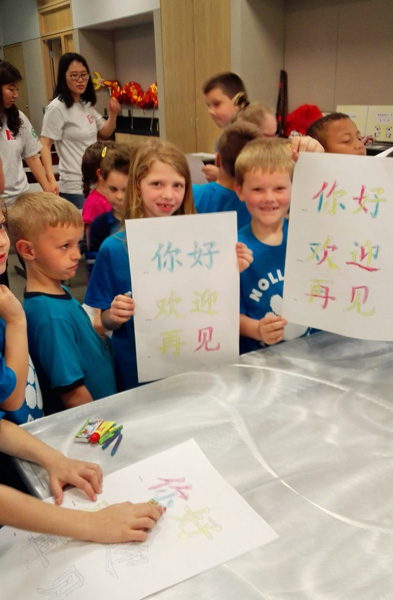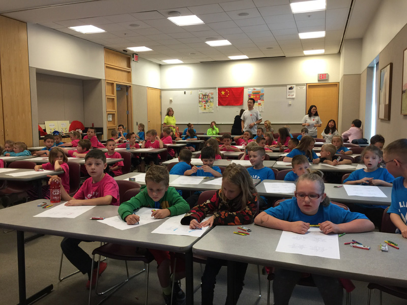 5月13日主要是文化学习。上午,孔院所有职工及明陞m88官方网站地址的访问学者秦明周、Nancy、崔晓飞、郑巧斐、郭浩、成金环、赵昕、师小静、宋轩、王希冀、秦成喆、赵华伟等10多人,一早到达会场,布置“中国教室”。大家把从孔院带来的中国地图、中国国旗等布置在教室前后白板的中心显眼位置,两侧悬挂了“中文笔画”、“常用汉字”等彩色图片,壁柜上摆出了中国龙、毛笔、“美猴王”、“大型识字卡片”、“熊猫汉语教材”等。在教室门口,竖起了孔院旗帜,孔院的绿色徽标与孔院简介醒目耀眼。活动中,先后有阿克伦学区公校、Nolley、Findley等5所学校近300名孩子,分成5个批次,来到中国教室。首先是,郑老师等教孩子们学习最常用的汉语“你好”、“欢迎”、“再见”;然后,郭老师等教唱中国儿歌“新年好”。孩子们对中国文化兴趣很高,互动气氛活跃,随行的老师与家长十分满意。