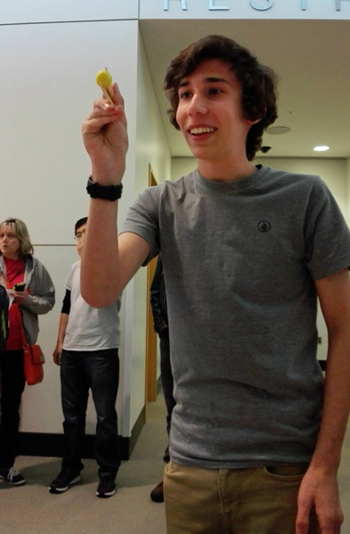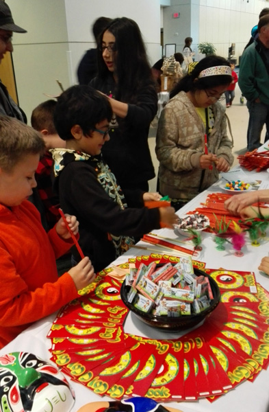 5月14日是文化展示,孔院展台布置在教室与剧院之间的走廊上,展台上摆放了“中国十二生肖卡通书”、“蜡笔”、五颜六色的“球状口香糖”、带红色纸袋的筷子、毽子、箜竹、提偶狮子、脸谱、中文识字卡片等,色彩鲜艳,吸引了许多不同年龄层次的观众。踢毽子、抖箜竹、舞龙、玩狮子、看图学汉字、用筷子夹糖果、练太极、折纸等,中国特色的参与式活动丰富,场面热闹。尤其是“用筷子练习夹圆球口香糖”,几乎所有路过的大人小孩都要停下来,一试身手,赢得了大家喜爱。夹起糖果者不仅可以获得一双筷子,而且还有一本中英文的生肖故事书和蜡笔。参加活动的老师们志愿者不仅要向观众讲解如何拿筷子,还要与观众一起,共同练习夹糖果。成功的参与者还要求照相留念,笑声此起彼伏。