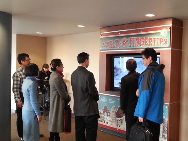 会谈结束后,徐参赞一行由在孔院中方院长陪同下,到学生中心二楼大厅查看了新建的以孔院总部捐赠设备为主体,建设的国际文化体验中心——指尖上的世界“the world at your fingertips”。徐参赞对利用孔院设备,结合当地学校需求,扩建文化体验中心的做法给予高度评价。希望孔院的中方教师继续努力,为推广中国文化与语言,让美国人民全面了解中国做出更多贡献。