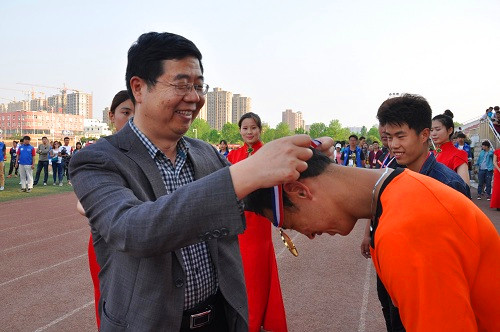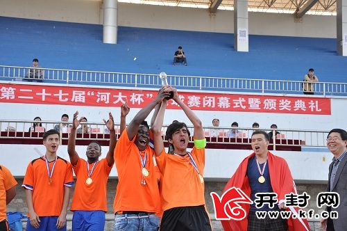 与会领导为本届“河大杯”冠军得主国际汉学院队、亚军得主研究生代表队和季军得主民生学院队颁发奖杯和奖牌,同时还颁发了最佳裁判员奖、最佳球员奖、最佳射手奖、最佳门将奖、精神文明奖和体育道德风尚奖。