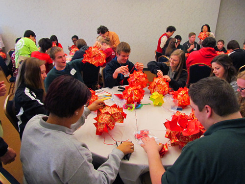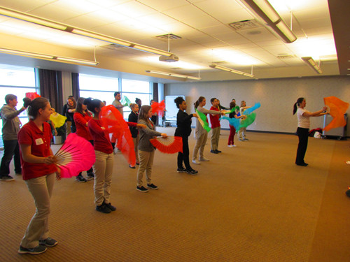 活动开始,全球关系协会阿克伦市主席Michelle Wilson女士致欢迎辞。现场人员先后听讲了中国春节、春联、茶艺、扇子舞、红灯笼、太极等文化讲解,观看了中国电影“过大年”,练习了太极、写对联、叠红包、做灯笼、跳扇子舞、品中国茶等,处处洋溢着欢快气氛。随后,学生们分别表演了“学会中国话,走遍天下都不怕”、“学中文不难”、“北京欢迎你”、“三句半”、“绕口令”、“旗袍秀”、“广场舞”、“小苹果”、“古词朗诵与演唱”等十几个节目,孔子学院教师秦明周、李康、访问学者郭明等做比赛裁判。