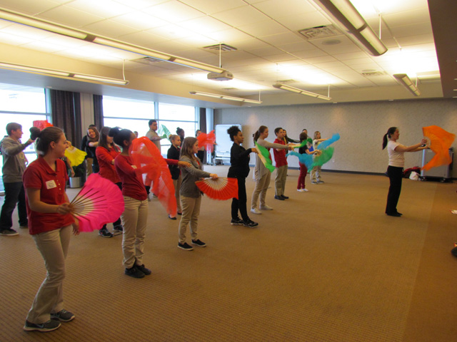 活动开始,全球关系协会阿克伦市主席Michelle Wilson女士致欢迎辞,接着,学生们先后听讲了中国春节、春联、茶艺、扇子舞、红灯笼、太极等文化讲解,观看了中国电影“过大年”、练习了太极、对联写作、叠红包做灯笼、跳扇子舞、品中国茶等,处处洋溢着欢快气氛。随后,学生们分别表演了“学会中国话,走遍天下都不怕”、“学中文不难”、“北京欢迎你”、“三句半”、“绕口令”、“旗袍秀”、“广场舞”、“小苹果”、“古词朗诵与演唱”等十几个节目,孔院教师秦明周、李康、访问学者郭明等做比赛裁判。
