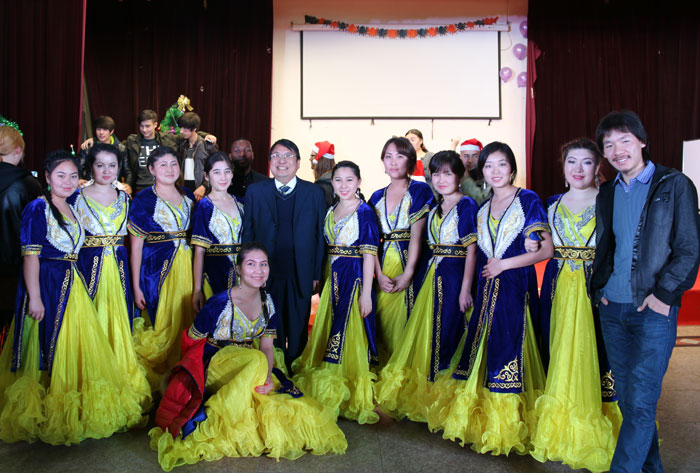 新年联欢会在欢快热情的舞蹈《KARA JORGO》中拉开帷幕,这个节目由吉尔吉斯斯坦和哈萨克斯坦的同学共同表演,他们精彩的舞蹈赢得了在场观众此起彼伏的欢呼声。接下来由乌兹别克斯坦、哈萨克斯坦、乌克兰、刚果共和国、西班牙、赤道几内亚等国的同学带来的节目也让大家欢笑连连、掌声阵阵。在联欢会的游戏环节中,大家踊跃参加,积极答题,现场气氛十分热烈。在有关中国文化知识的抢答游戏中,同学们争先恐后的回答问题,体现出了对中国文化的喜爱和了解。来自哈萨克斯坦的柏拉提同学虽然来到中国只有三个月的时间,但是对中国文化却十分了解,在抢答环节中连连抢到答题机会并回答正确。在场的同学看到这个情景,不禁竖起大拇指称赞他:“他真是一个中国通啊“。