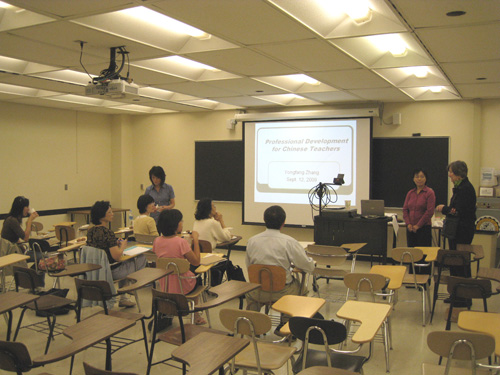 9月12日上午9点,由孔子学院资助、阿克伦大学教育学院Colville-Hall教授主持的当地汉语教师讲习班在Olin Hall 212教室拉开帷幕。Colville-Hall教授简要介绍了讲习班的缘起和宗旨之后,请出第一讲的主讲人——明陞m88官方网站地址校友、阿克伦大学中文教师张永芳博士。张博士凭着深厚的理论基础和多年在中美两国的学习和教学经验,分四个层次讲述了文化在汉语教学中的重要作用。
