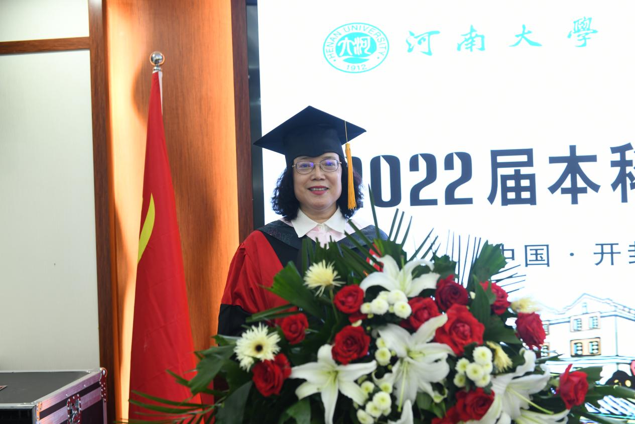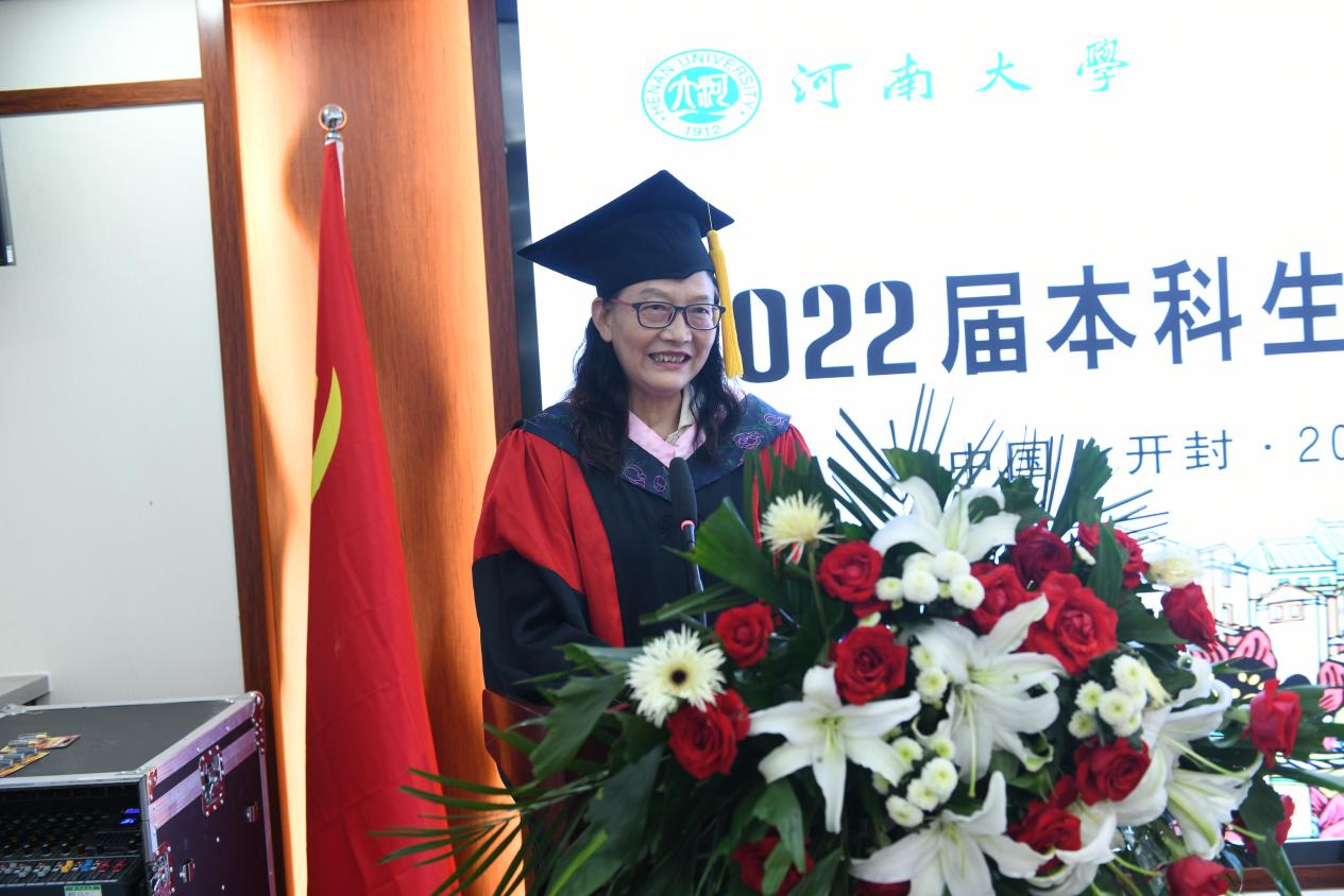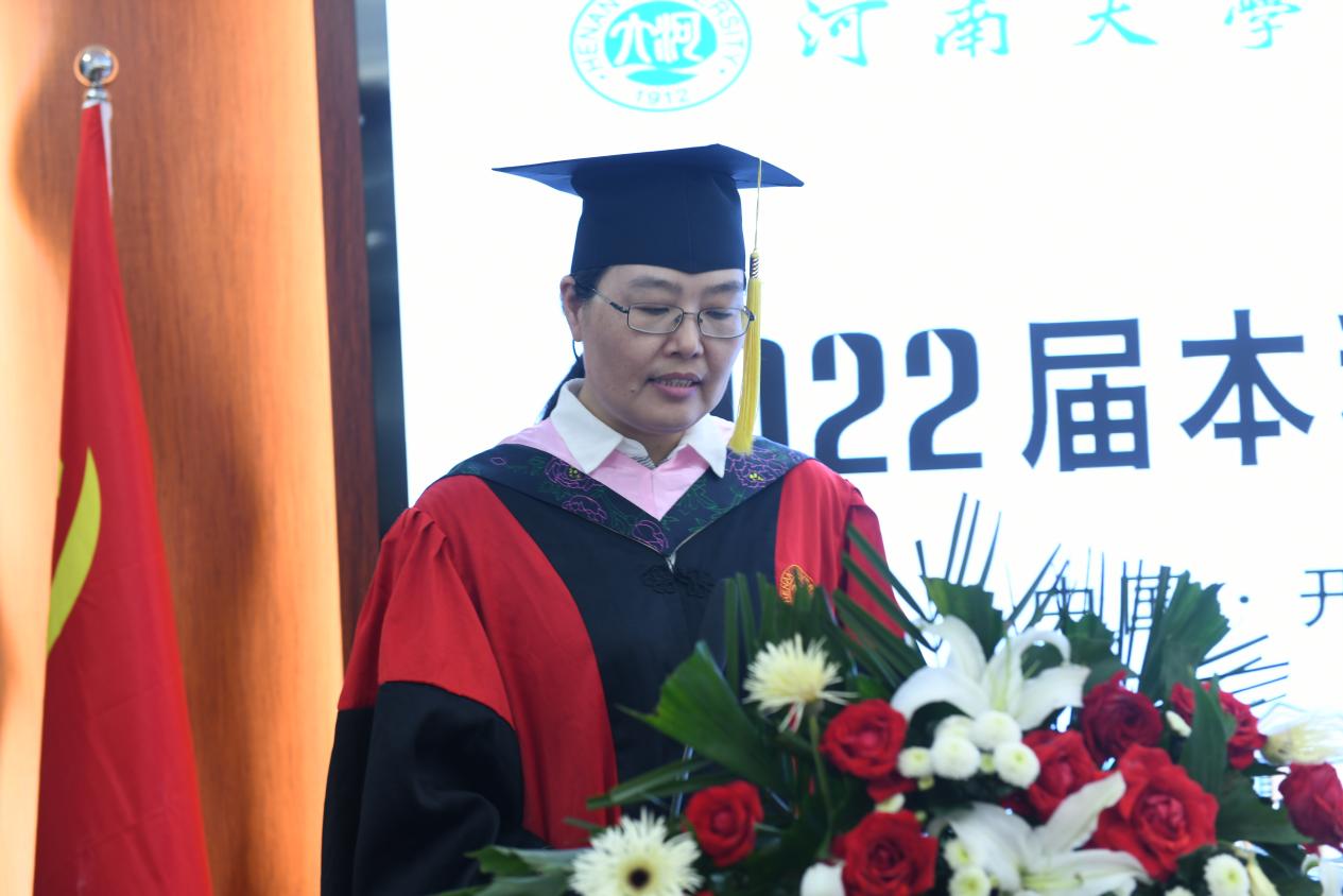 刘绣华教授为在校本科毕业生代表援正流苏并深情回顾同学们在校期间的种种经历和经受的考验,寄语毕业生。她希望同学们谨记知识因厚德而至善,能力因气质而卓越,情怀因责任而升华。要立大志、明大德、担大任,做促进中国与各国之间语言文化交流的友好使者。