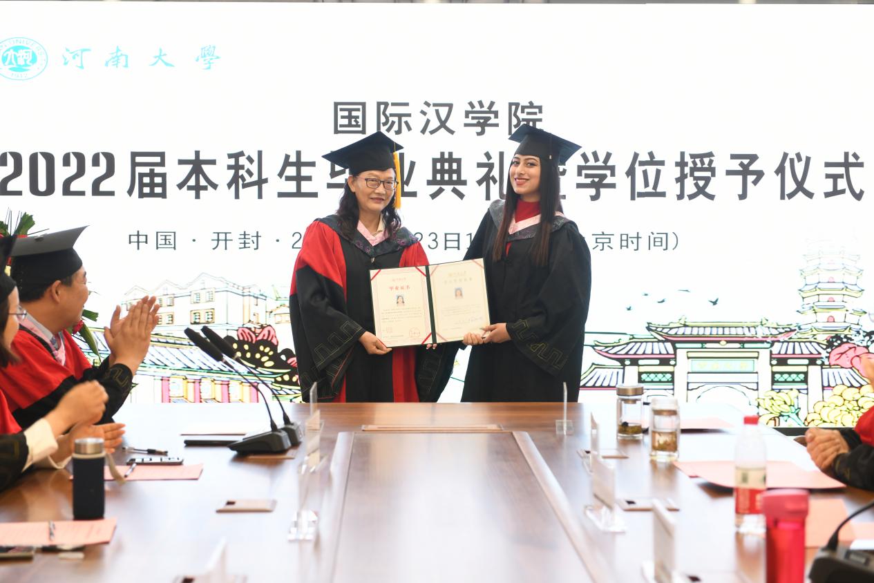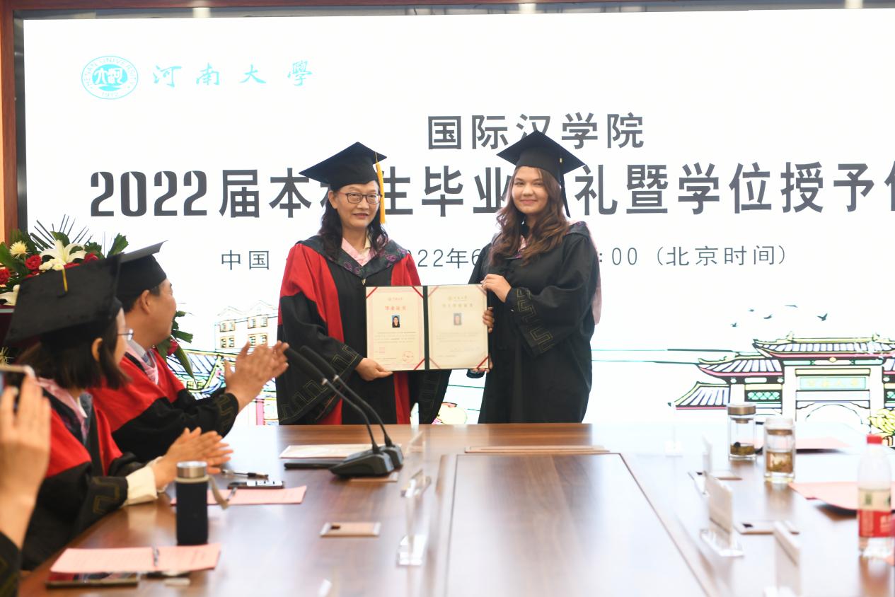 院长刘绣华为在校毕业生代表哈萨克斯坦学生卡提亚(上图)、委内瑞拉学生王婕(下图)颁发毕业证、学位证