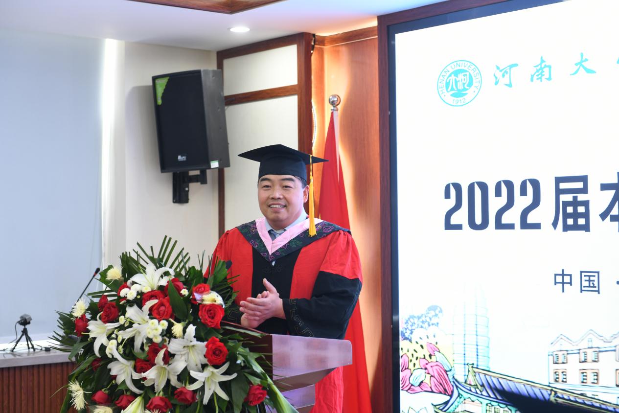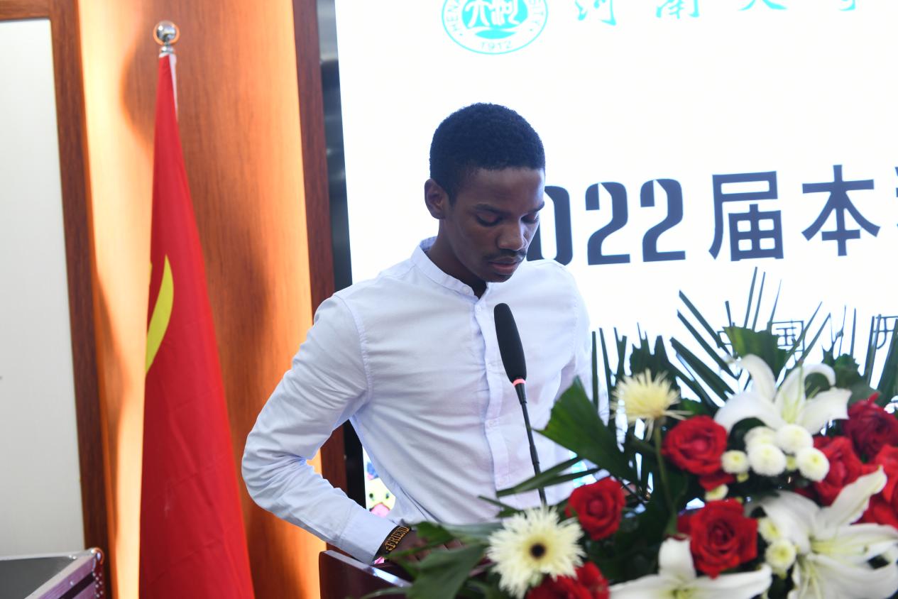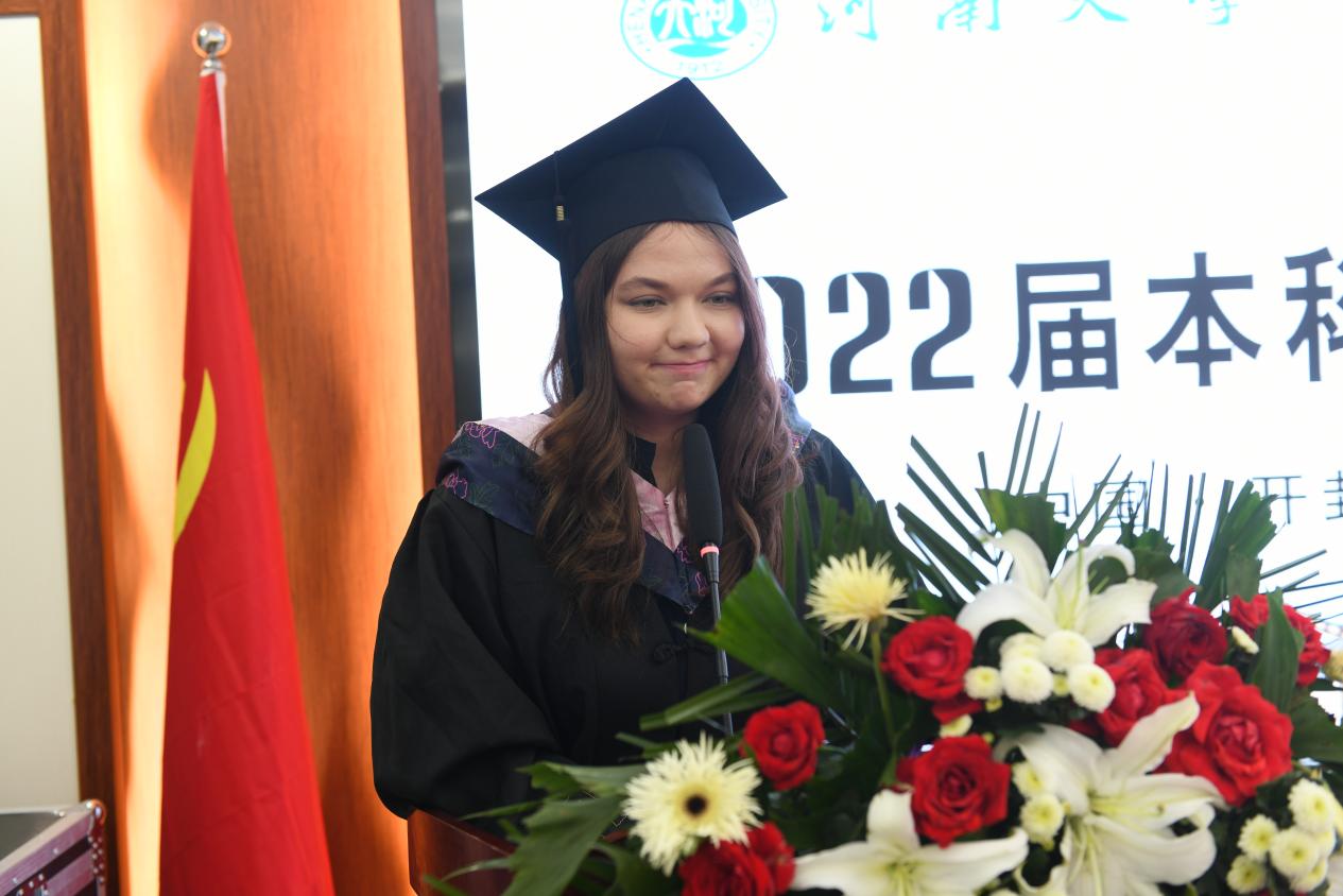 来自泰国的许雪玉同学代表2022届本科毕业生进行线上发言,她将谨记“明德新民,止于至善”的校训,将其内化于心外化于行,不负时代,不负韶华。最后,她代表国际汉学院2022届本科毕业生感谢中国政府、学院领导和老师们对大家的支持和关爱。2022届在校毕业生代表哈萨克斯坦的卡提亚同学表示,奋斗是青春最亮丽的底色,行动是青年最有效的磨砺,回望同学们四年来的成长历程都是青春奋斗的印记。最后她也真诚地感谢老师们四年来的关心与帮助。2019级的巴山同学作为在读学生代表向学哥学姐们表达了祝贺与感谢。