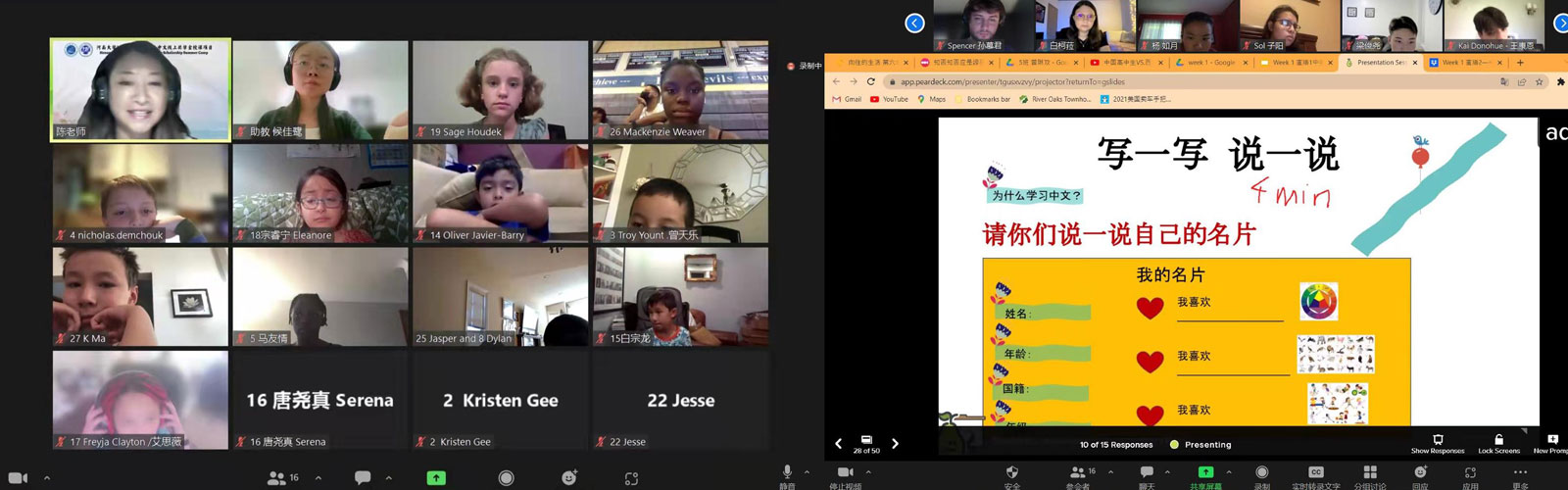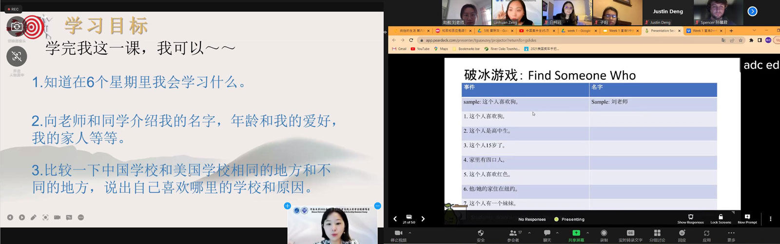 开班仪式结束之后,本期项目的6个教学班分别开展了第一次直播课教学活动。各班授课教师、助教与美国学生互相介绍认识、进行破冰游戏,并通过云游,对比中国古代学校(开封大梁书院)与中国当代学校的异同(校园环境、教室环境、课程设置等),从而正式开启为期3个月(9月2日—11月23日)的中文学习之旅。