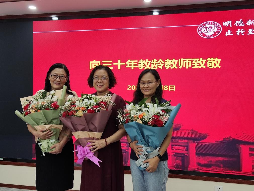 在第38个教师节来临之际,为感谢教龄30年以上教师为学校教育事业的辛勤付出,学院为刘绣华、马惠玲、李康等三位老师献花致敬。