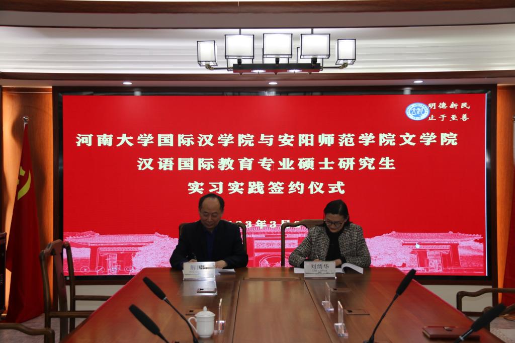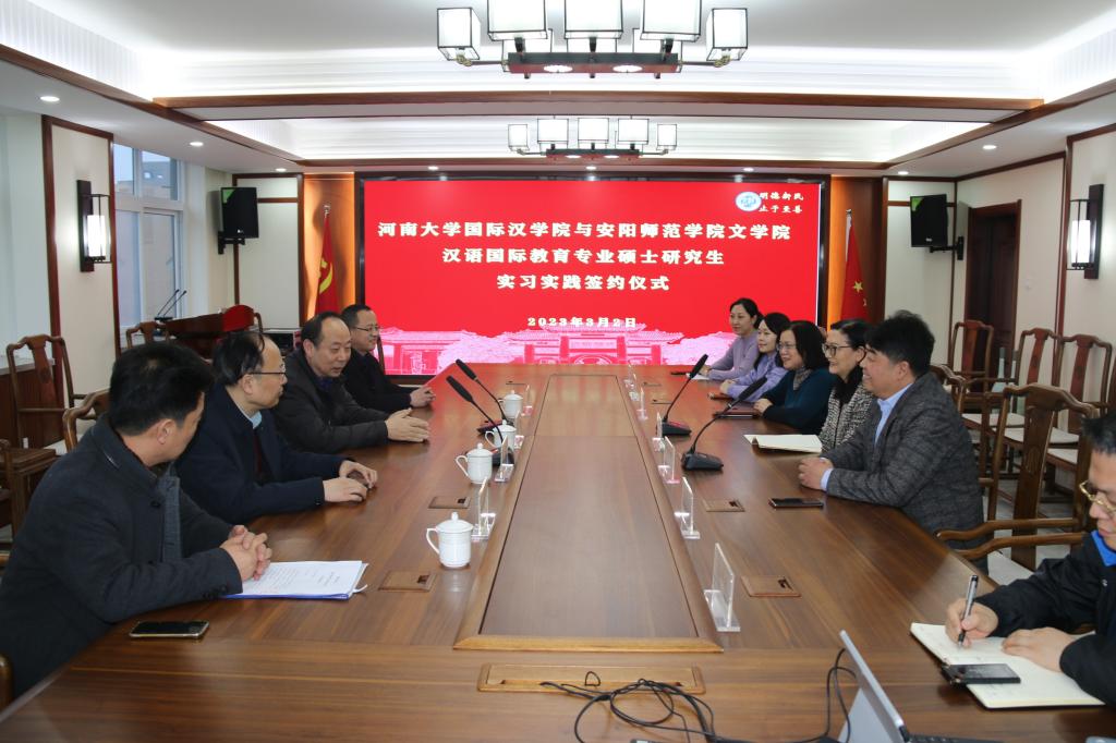 3月2日下午,明陞m88官方网站地址国际汉学院与安阳师范学院文学院举行了汉语国际教育专业硕士研究生实习实践协议续签仪式。国际汉学院党总支书记梁建忠、院长刘绣华、副院长马惠玲,安阳师院文学院院长解国旺、学科带头人翟传增、康国章及办公室主任王兆国等出席了签约仪式。会议由梁建忠书记主持。