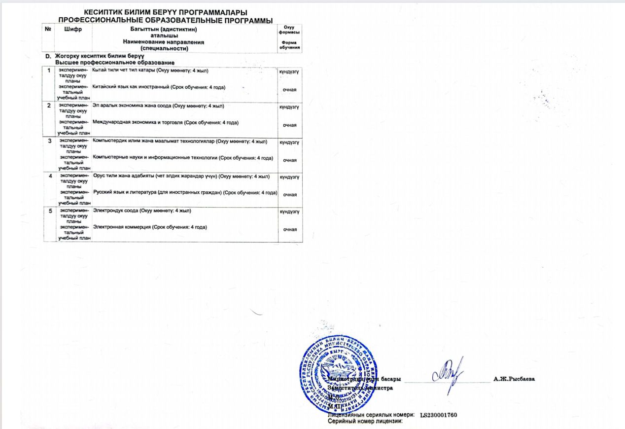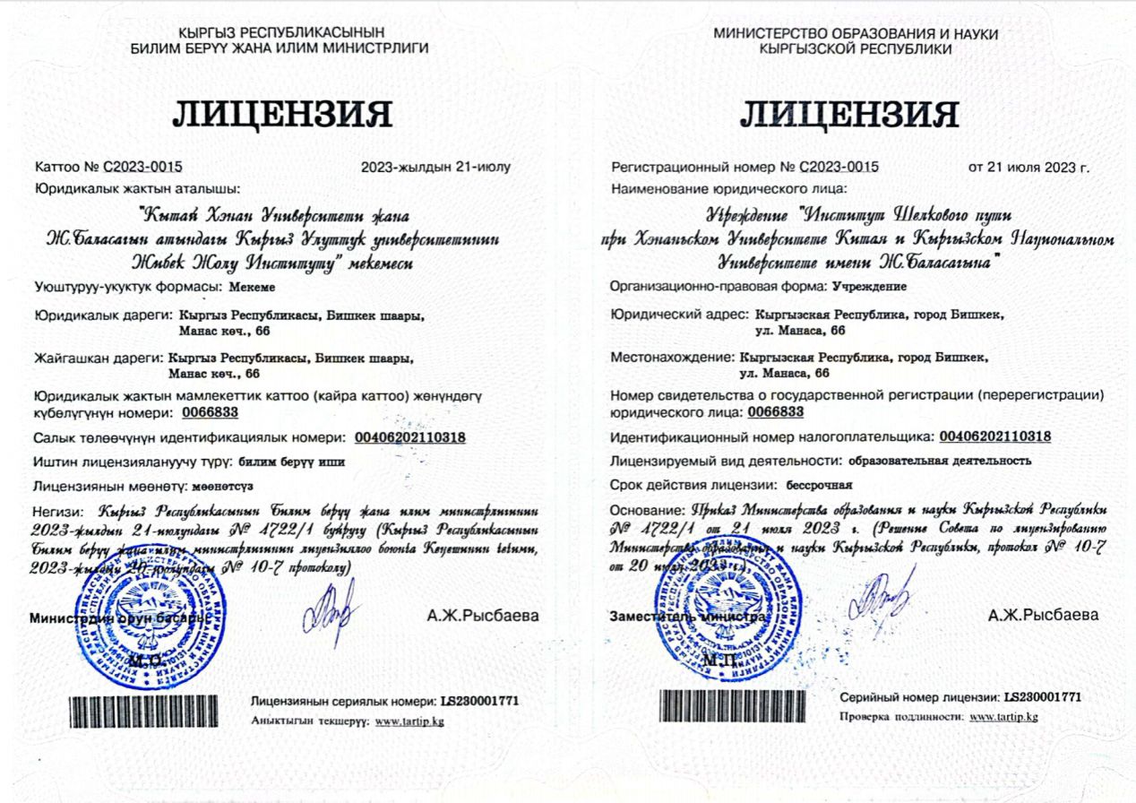 近日,明陞m88官方网站地址与吉尔吉斯斯坦民族大学合办的中国明陞m88官方网站地址——吉尔吉斯斯坦民族大学丝绸之路学院顺利通过吉尔吉斯斯坦教育与科学部对学院独立办学资质的考察,获得其颁发的办学许可证,取得独立办学资质。本次获批的五个本科专业分别为:汉语国际教育、国际经济与贸易、计算机科学与信息技术、俄语语言文学以及电子商务。