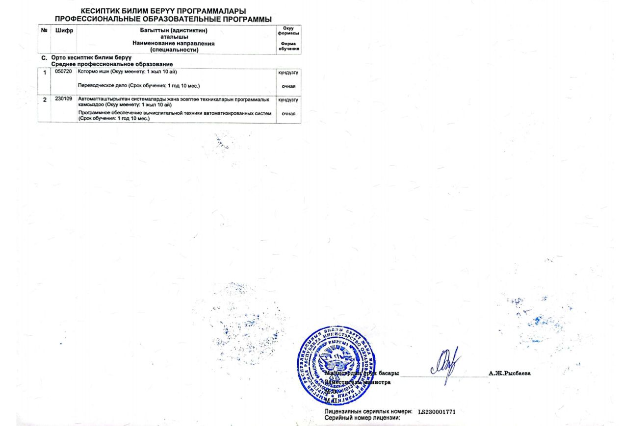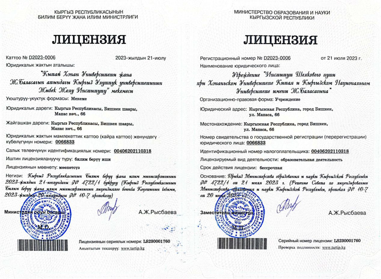 丝绸之路学院于2021年10月揭牌成立,于2022年9月联合招收56名新生。2023年7月11日,吉尔吉斯斯坦教育与科学部督导考察组专家到丝绸之路学院考察本科生招生资质相关情况,随后由吉尔吉斯斯坦政府外交部、国有资产部、财政部、教育科学部、文化部等九个部长参加的部长会议讨论通过并由总理签署后颁发许可证。