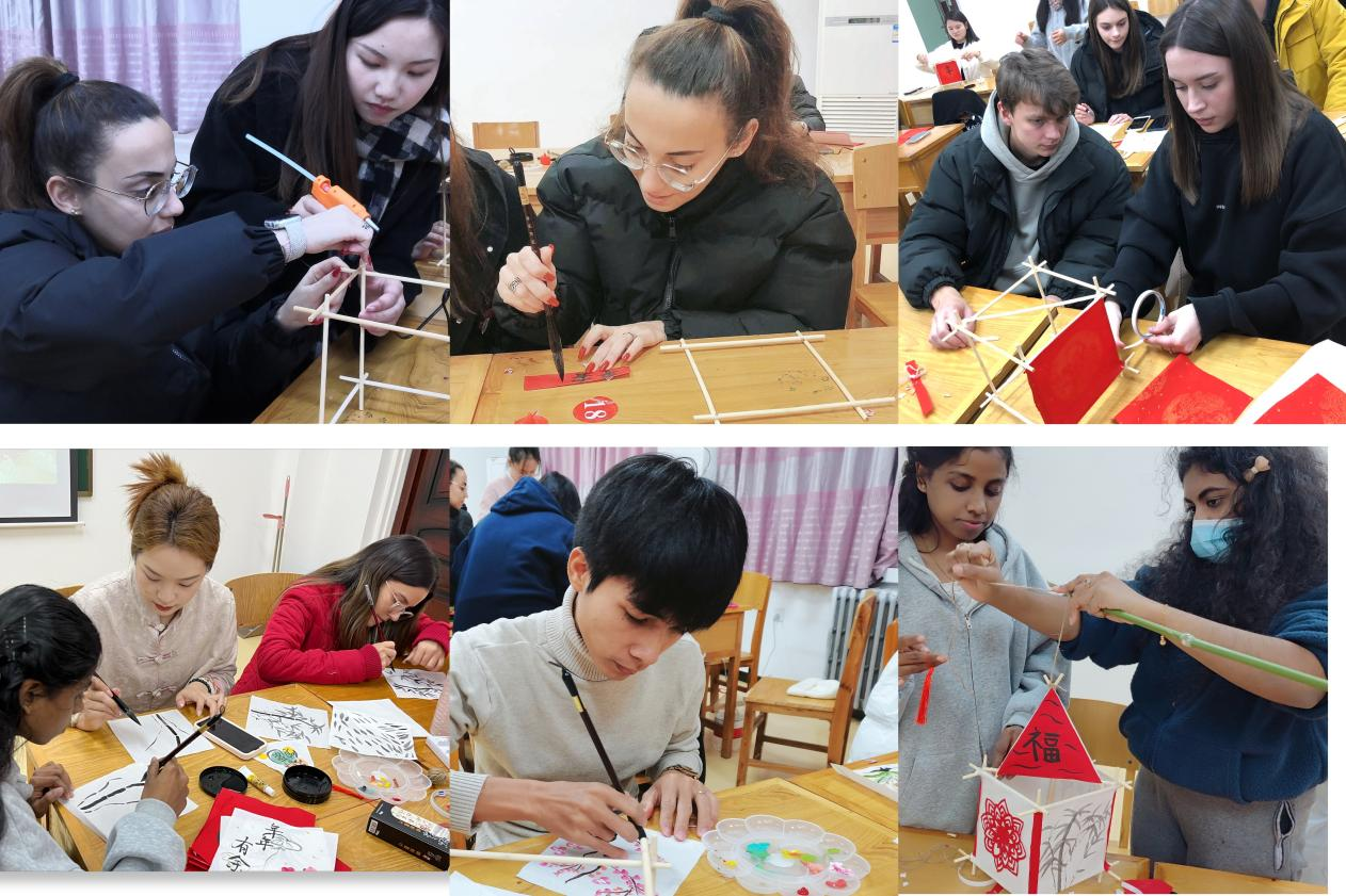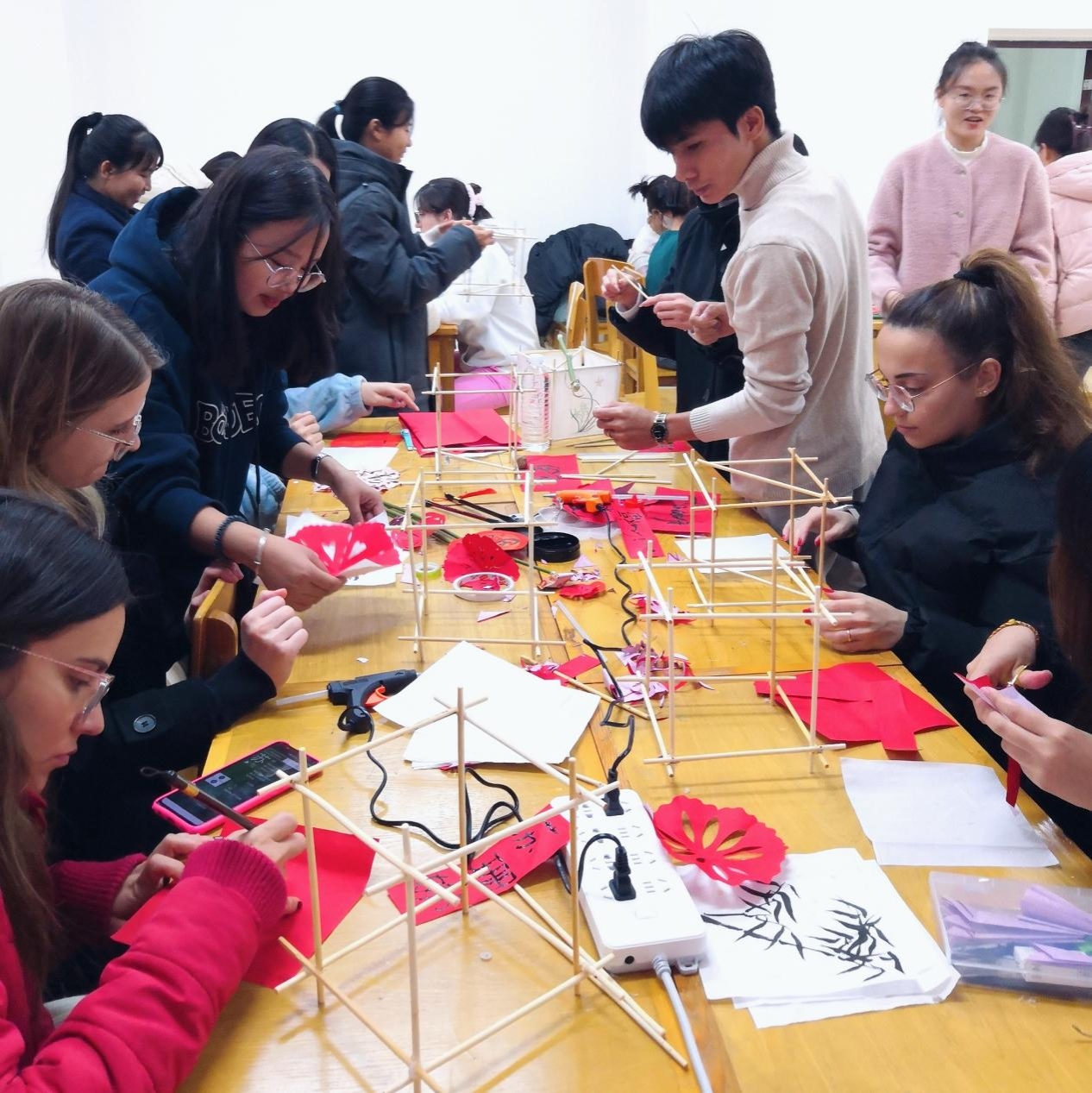 接下来是灯笼装饰部分,实习生在演示完中国画、剪纸和书法等艺术形式后,明陞m88官方网站地址们有的剪出各式各样的窗花图案,有的毛笔一挥,在红纸上写出自己喜欢的汉字,有的精心调色,画出红梅、墨竹、月亮等图案……粘贴完灯笼的外皮后,系绳子、挂彩灯、坠流苏,一个个精巧的灯笼便制作完成。在随后进行的趣味猜灯谜环节,实习生们根据汉字的构字方式,让明陞m88官方网站地址在汉字的拆合中感受汉字字谜的无穷乐趣。
