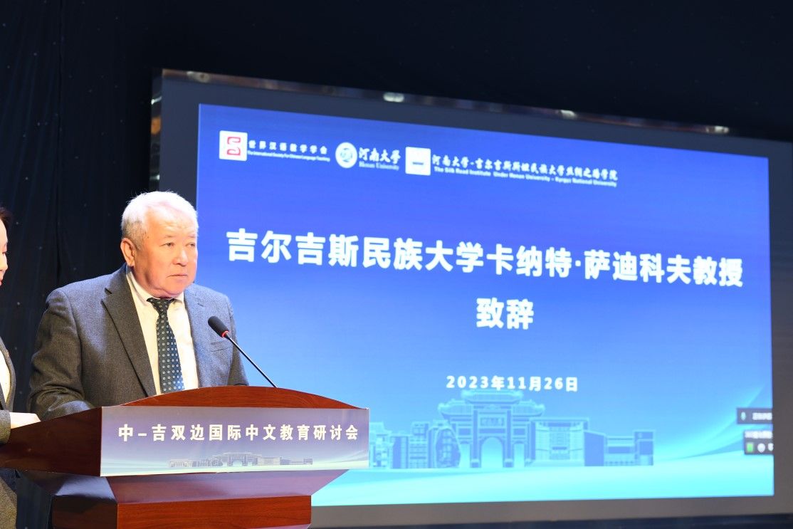吉尔吉斯民族大学原校长卡纳特·萨迪科夫教授在致辞中指出,吉尔吉斯斯坦人民对汉语学习兴趣日益增强,视汉语为重要职场技能。他建议加强大学间合作,结合中国文学研究,推动汉语学习,促进两国经济合作与语言发展。