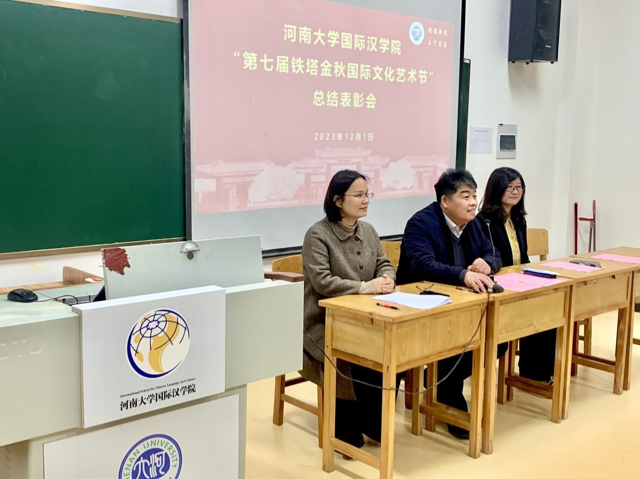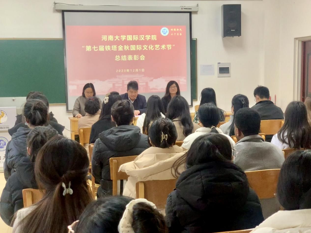 为发扬传统,总结经验,树立榜样,表彰优秀,12月1日下午,学院在201教室召开第七届“铁塔金秋国际文化艺术节”表彰会。学院党总支书记梁建忠、副书记王林丽,第一教研室主任郭闰,党总支办公室工作人员,以及50余名艺术节志愿者、节目指导、节目代表参加会议,会议由王林丽主持。