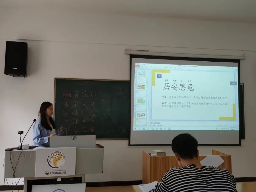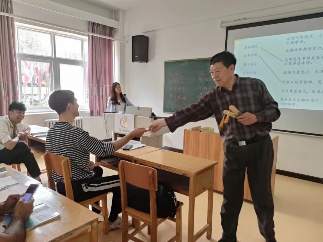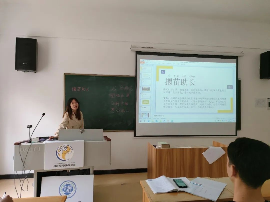 两位研究生助理兼顾科学性和趣味性,同样为大家带来了精彩的成语讲解。她们寓教于乐,围绕“杯水车薪”“居安思危”“望梅止渴”等中国历史故事,对成语语义、语法、语境、语用进行教学,让同学们明白了成语的搭配规则、语法功能等。