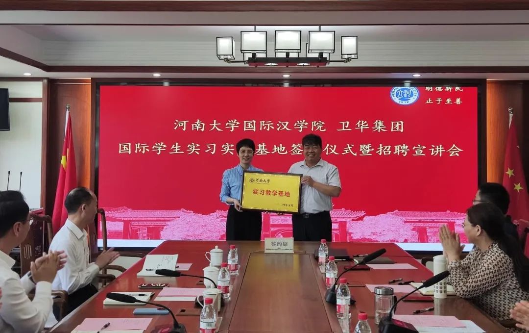 双方签署了国际学生实习实践教育基地建设协议书,梁建忠代表学院为卫华集团授牌。双方就实习实践运行、产教融合、协同育人、校友资源、中华文化传播等方面进行了深入交流。