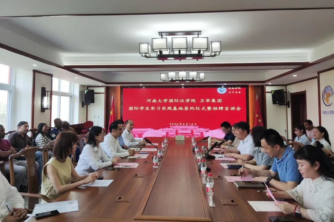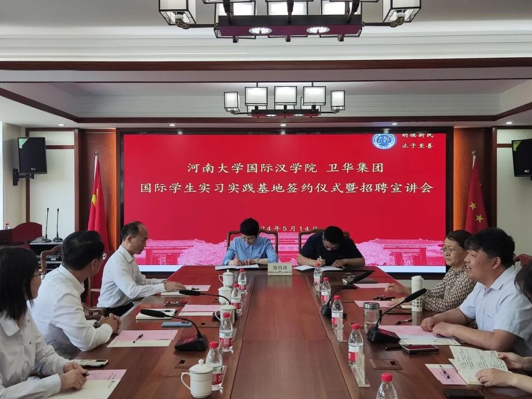 5月14日下午,国际汉学院和卫华集团在学院314会议室举行国际学生实习实践基地签约仪式暨招聘宣讲会。卫华集团CEO甄明明、人力资源副总裁马辉艳等一行4人,国际汉学院领导班子成员及30余名国际学生参加会议。会议由国际汉学院党总支书记、丝绸之路学院执行院长梁建忠主持。