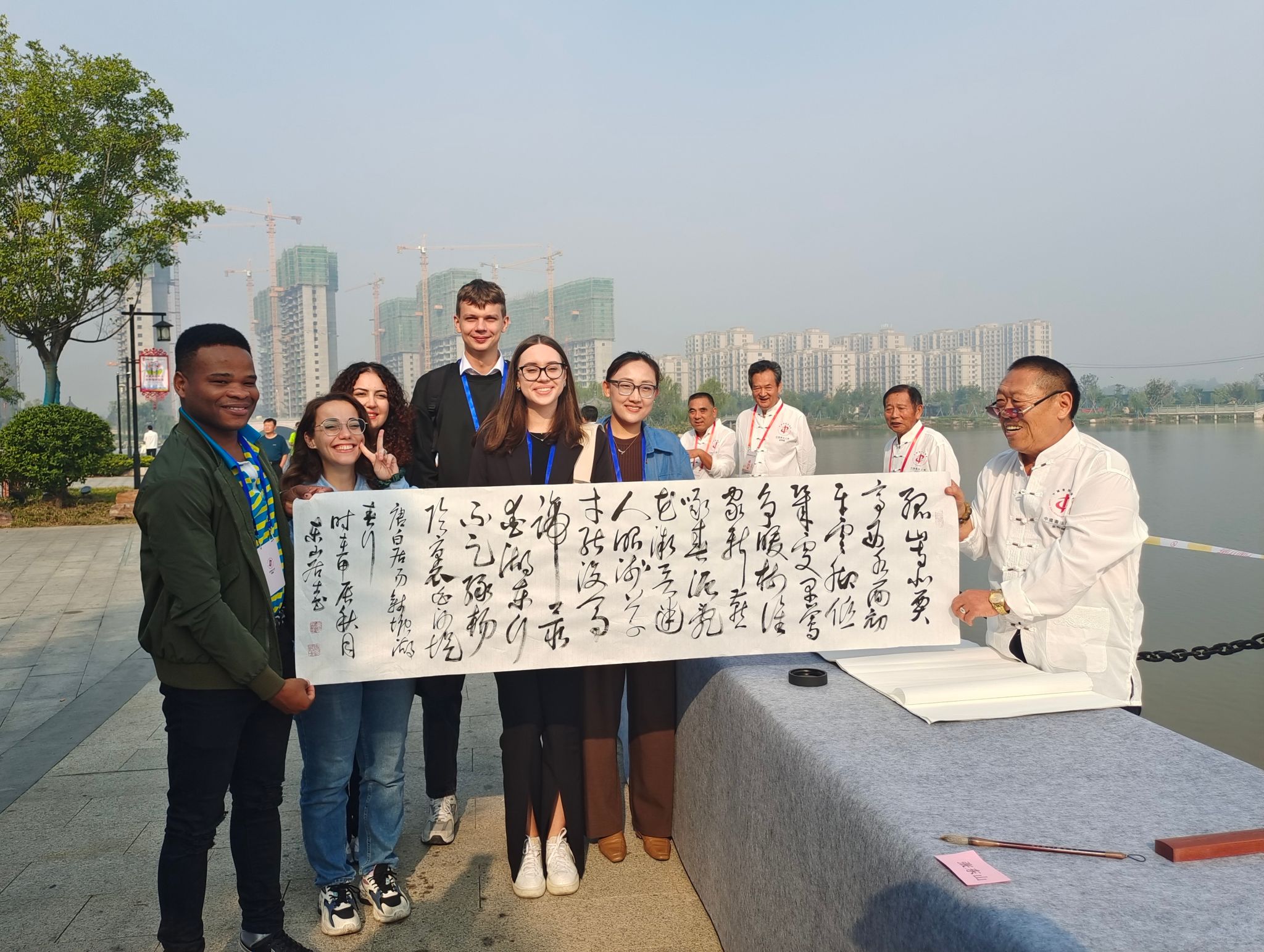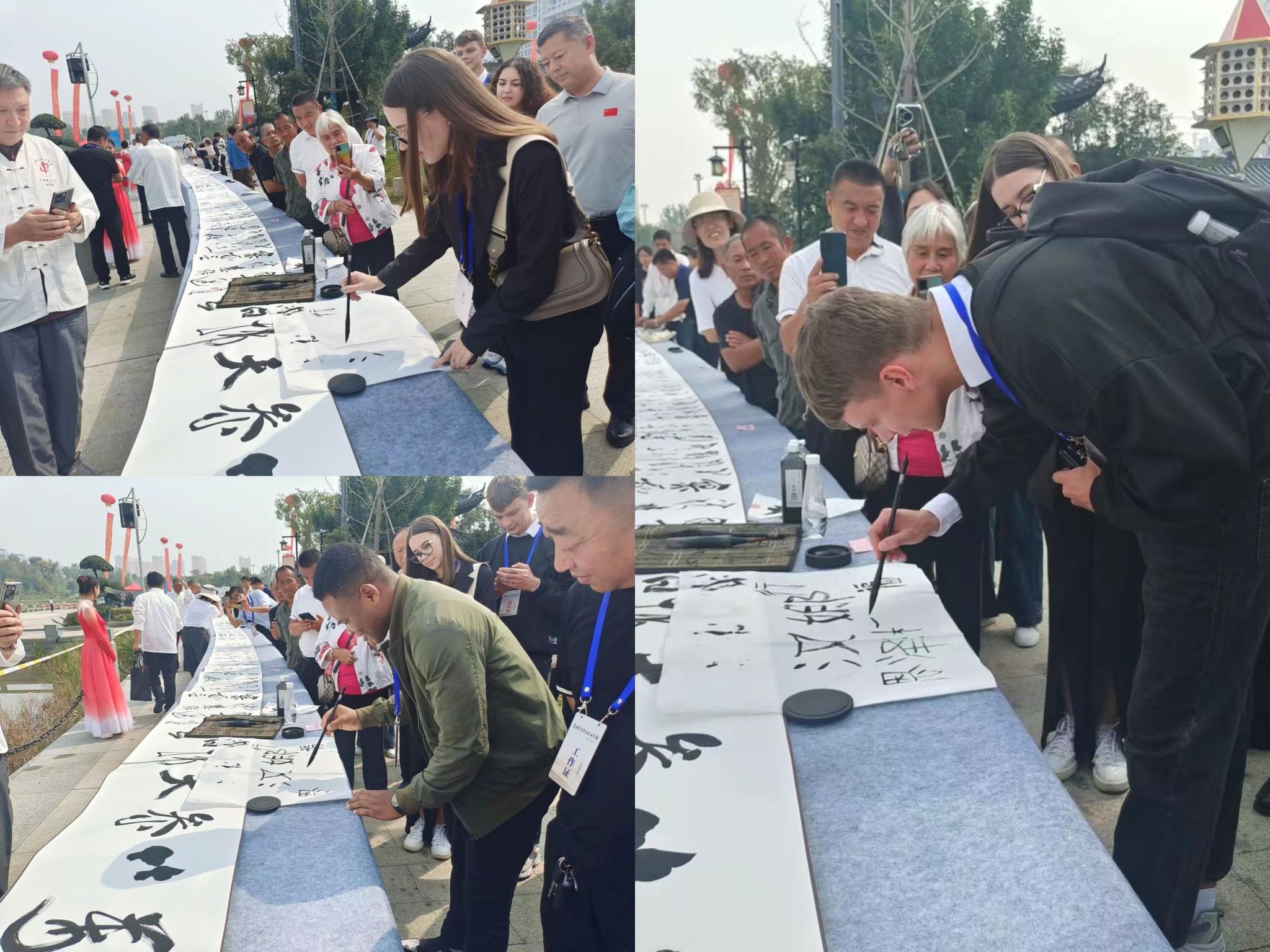 随后,同学们参与到“盛世中华 龙腾东明”老中青少百米长卷书写活动。他们认真学习,按照书法老师的示范,一笔一画描摹出对中华文化的喜爱,勾勒着中外文化交流互鉴的美好画卷。