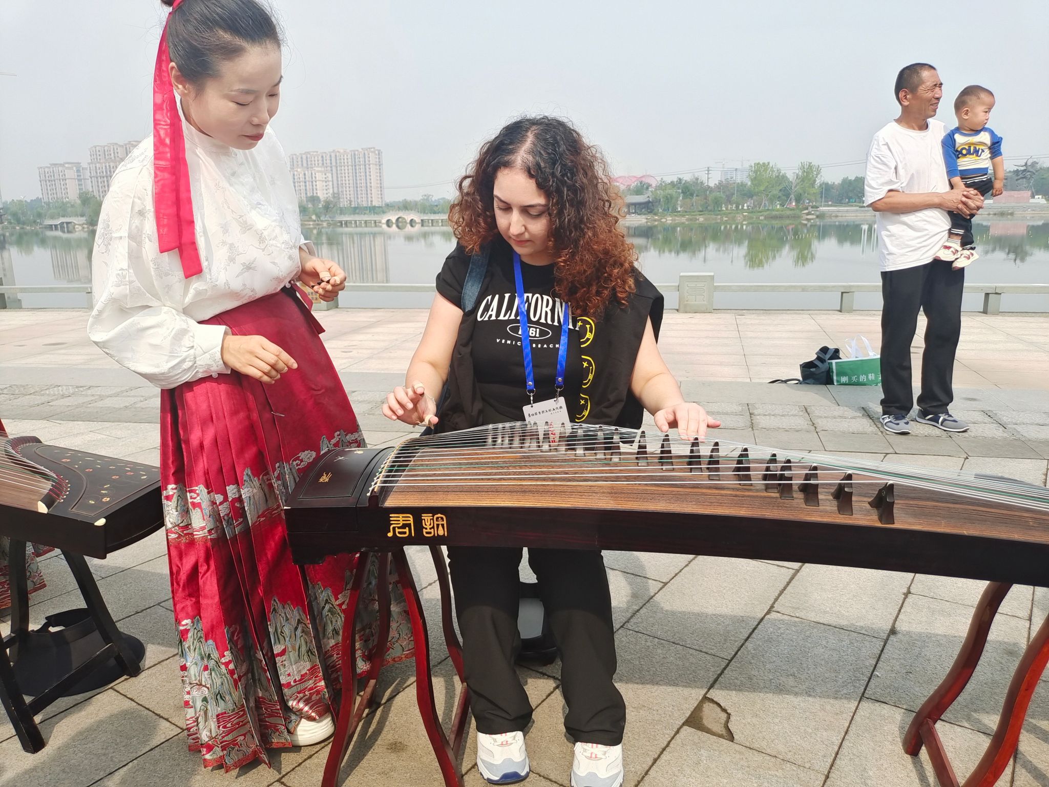 书写之余,国际学生被中国传统乐器所吸引。古琴深沉悠扬,琵琶清脆明亮,二者相得益彰,引无数同学跃跃欲试。“泠泠七弦上,静听松风寒。”在亲身体验中,勾、抹、挑等独特指法也让同学们不禁感叹中国传统文化的博大精深与无穷魅力。每一弦的振动,都似乎在诉说着古老故事,传递着先贤们的智慧与情感。同学们在学习的过程中,不仅了解了中国传统乐器的演奏技巧,更进一步理解其所承载的文化内涵与精神追求。