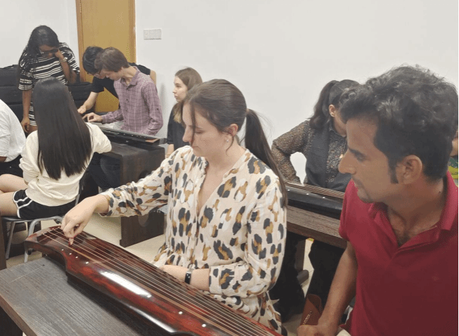 近日,在校团委的组织和指导下,明陞m88官方网站地址至善古琴社在明伦校区举办古琴体验课,国际新生热情参与。古琴社社长倾情讲述古琴文化的千年沧桑,引领国际学生漫步于历史的长河,探寻古琴艺术的深远足迹。社团成员们更是以极大的耐心与热情,手把手教导新生,让他们深切感受古琴艺术独特韵味。