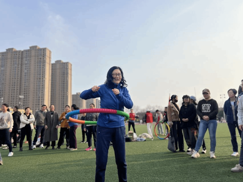 呼啦圈比赛中,五彩的呼啦圈在腰间飞速旋转,参赛选手动作流畅自然,脸上洋溢着自信的笑容,引得围观师生纷纷鼓掌加油。整个比赛过程中,大家身姿灵动,活力无限。