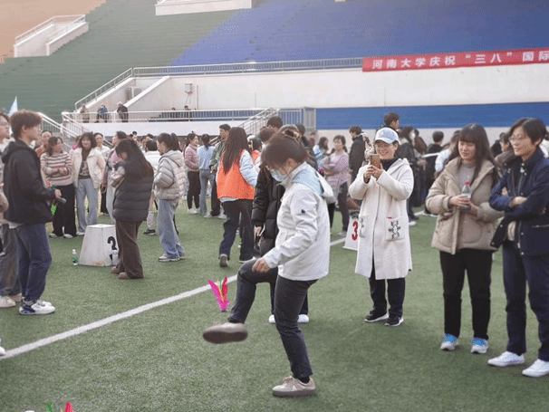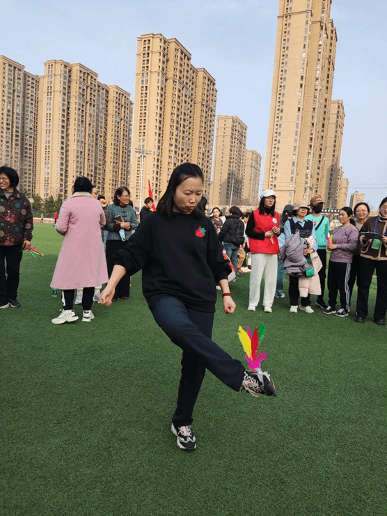 在个人项目踢毽球比赛的场地上,参赛教工动作轻盈,展现了高超的技巧。毽球在空中飞舞,教工们的身影也随之灵动跳跃,现场掌声、欢呼声此起彼伏,气氛热烈非凡。