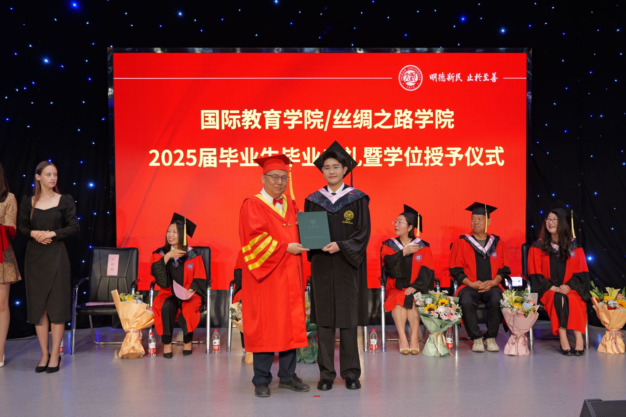 2025届本科毕业生代表谢美仙回顾了四年的求学时光,表达了对母校及师长的感恩之情,立志谨记学校教诲,继续传承中国文化,让世界听见中国声音。硕士毕业生甘婷婷分享了自己在学术研究中的收获与成长,表达了对学校和导师悉心指导的感谢。她表示,毕业不是终点,而是新征程起点,将充分发挥在校所学,积极促进文化交流,为母校增光添彩。