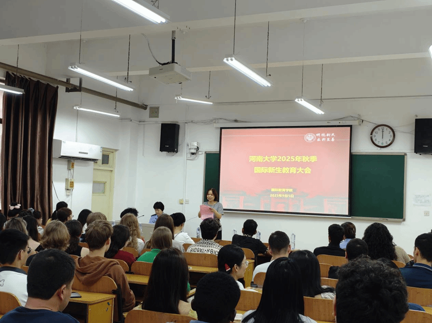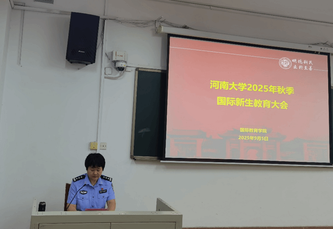 为增强国际新生法治意识,助力其深度理解校规校纪、快速融入校园生活,9月5日下午,学院于综合楼114教室举办2025级国际新生教育大会。开封市公安局出入境管理支队副支队长白宏杰、外管大队大队长卢炎文受邀莅临,学院党总支副书记王林丽、学生管理相关负责教师,及来自20多个国家和地区的100余名国际新生共同参会。大会由王林丽主持。