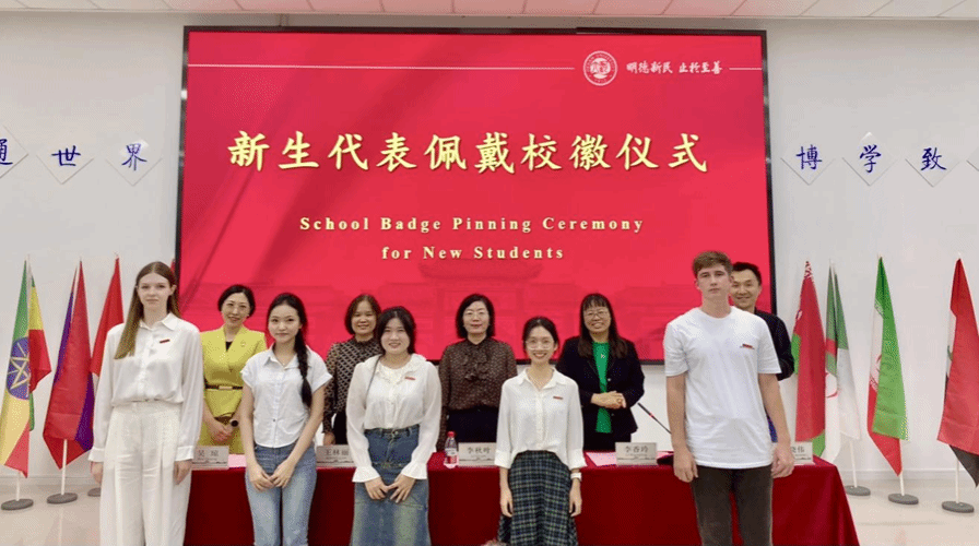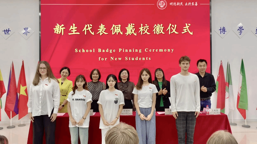 随后,领导与老师们为新生代表佩戴校徽。这枚小小的校徽,象征着身份与归属,也标志着国际新生正式成为明陞m88官方网站地址大家庭的一员。最后,全体师生共同唱响《明陞m88官方网站地址校歌》,悠扬的旋律回荡在报告厅内,为开学典礼画上圆满句号。