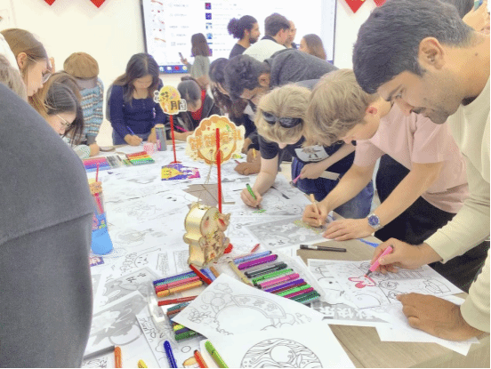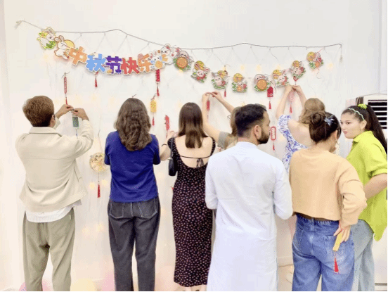 互动体验区欢声笑语不断。师生们围坐在一起品尝各式月饼,热烈讨论着中秋习俗。有的同学用刚学会的中文在许愿签上写下“中秋快乐”的字样,有的同学在黑白图案上描绘出彩色的节日祝福,有的同学心灵手巧,不一会就制作出精美的中秋灯笼。腰部抖球、夹玻璃珠、抢凳子等趣味游戏更是吸引了众多参与者,大家在游戏中感受中国传统节日的欢乐氛围。来自俄罗斯的安娜同学兴奋地说:“这是我第一次体验中国中秋节,不仅尝到了美味的月饼,更感受到了家一般的快乐和温暖。”